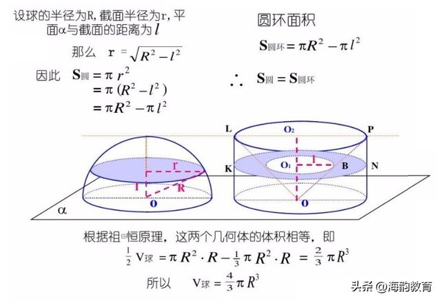 如上图,那个圆柱挖去那个圆锥部分之后,剩下三分之二的那个部分,刚好是球的体积的一半。圆柱的体积是π*r3,从而得到球的体积是三分之四派R立方。具体证明还是如下图所示的祖暅原理。感觉真的很神奇有没有!